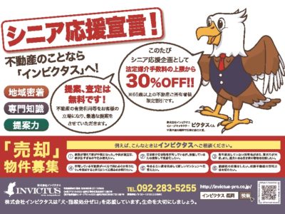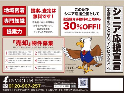この度シニア応援企画として、法定媒介手数料の上限から30%OFFさせて頂きます!(※65歳以上の不動産ご所有者様限定割引です。) ご所有の不動産の売却、住み替え等お考えの方、今後のことについて